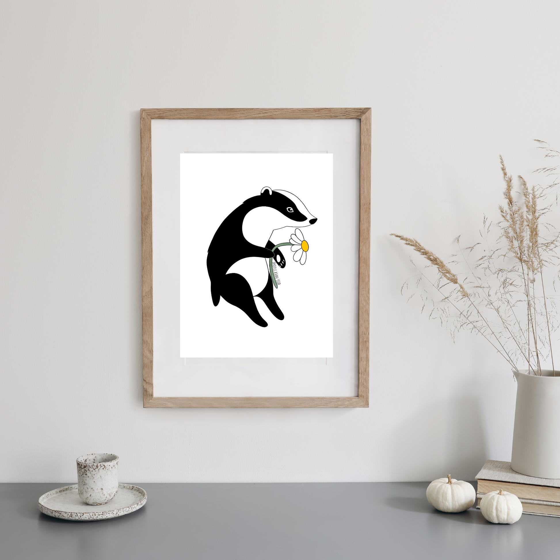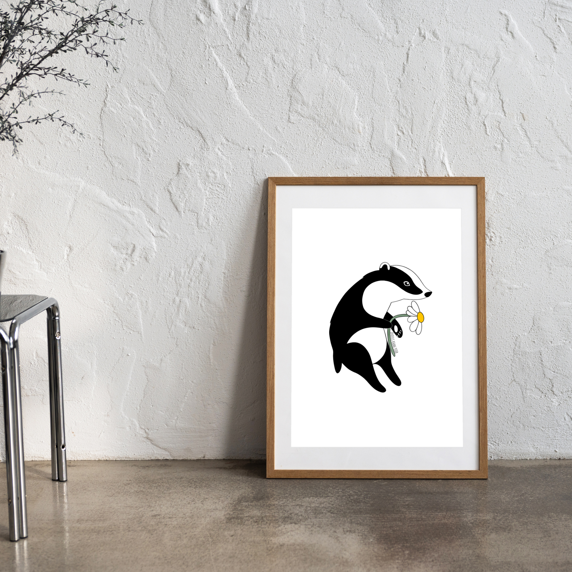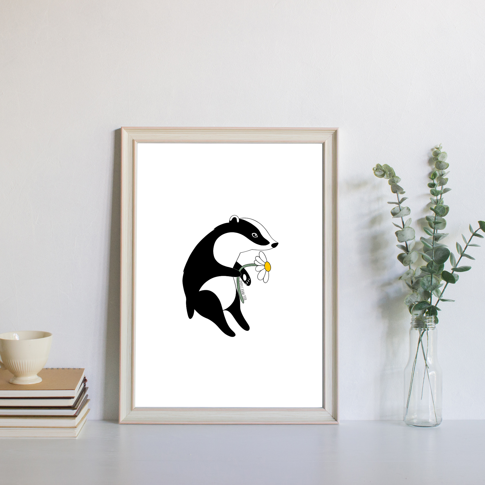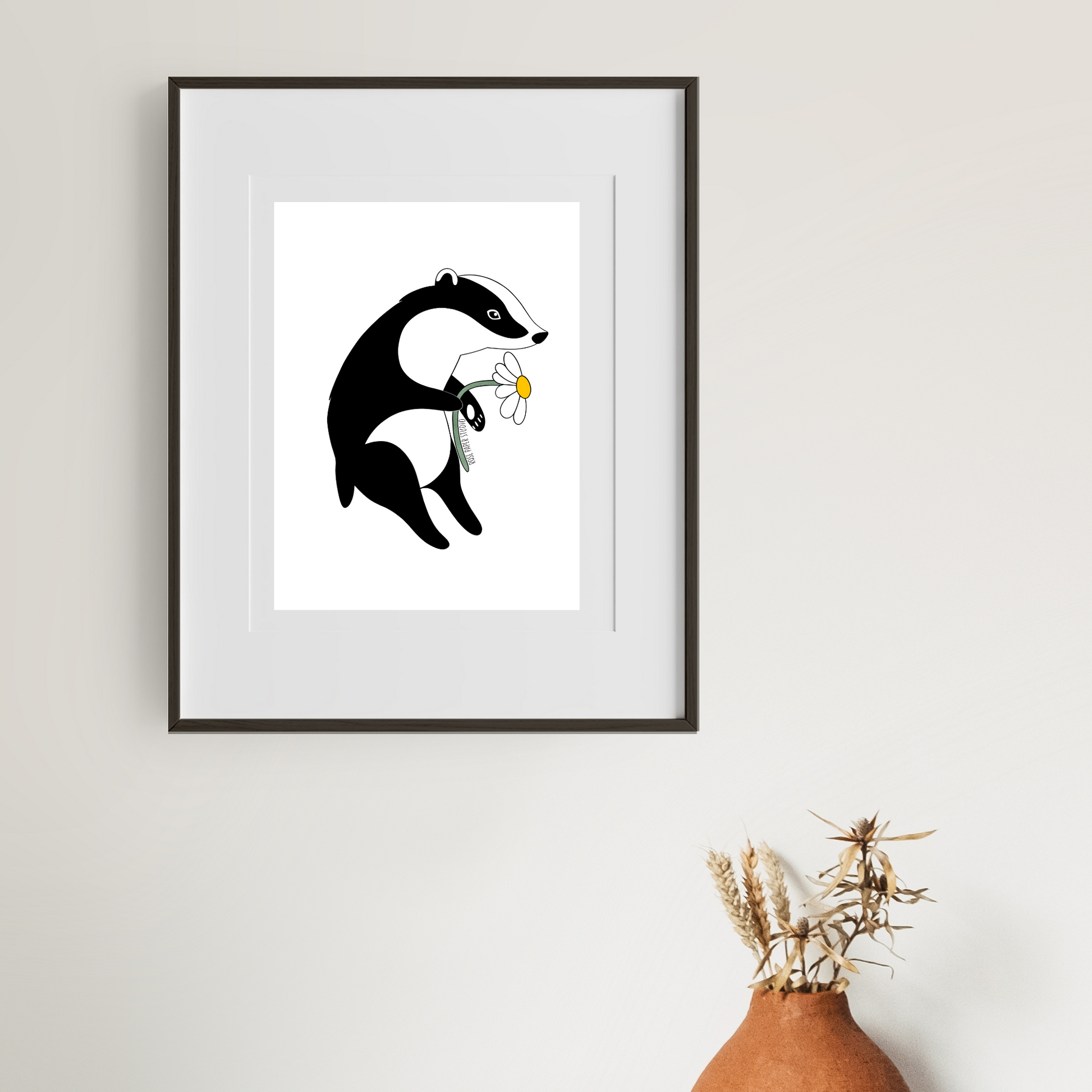 Bernadette the Badger Print | Badger with Daisy Botanical Art | Nursery Wall Art | Home Decor | Hand Drawn Animal Artwork