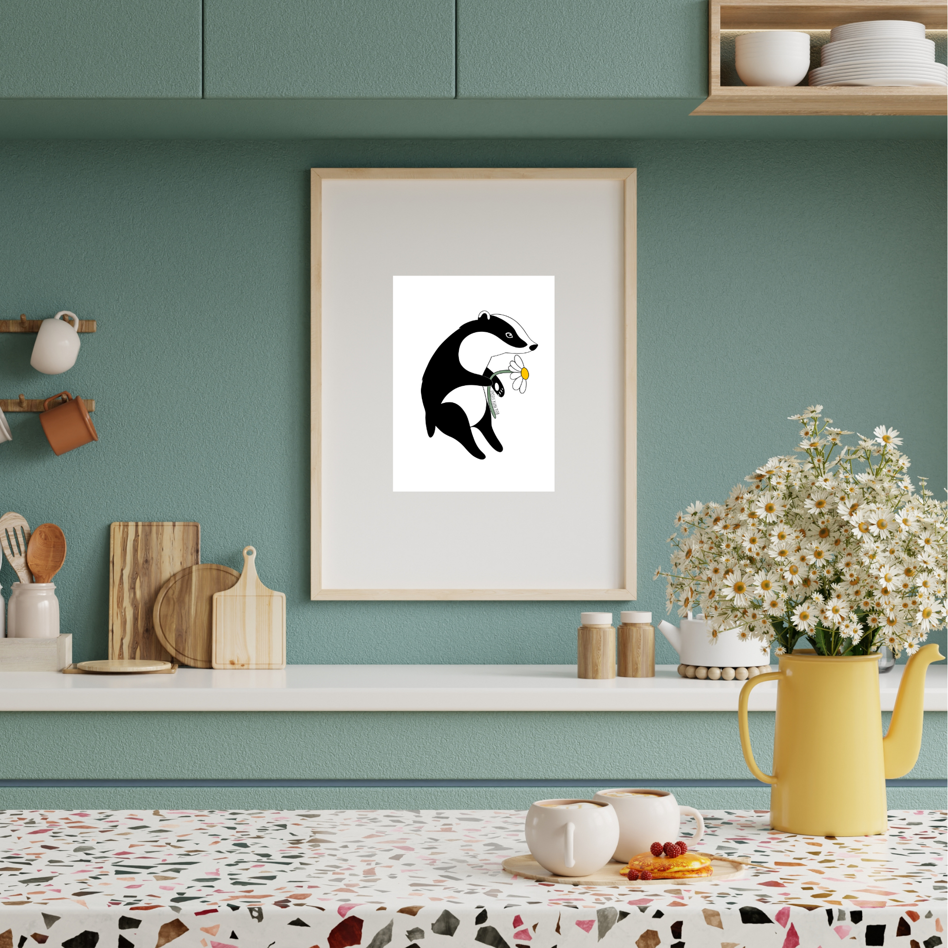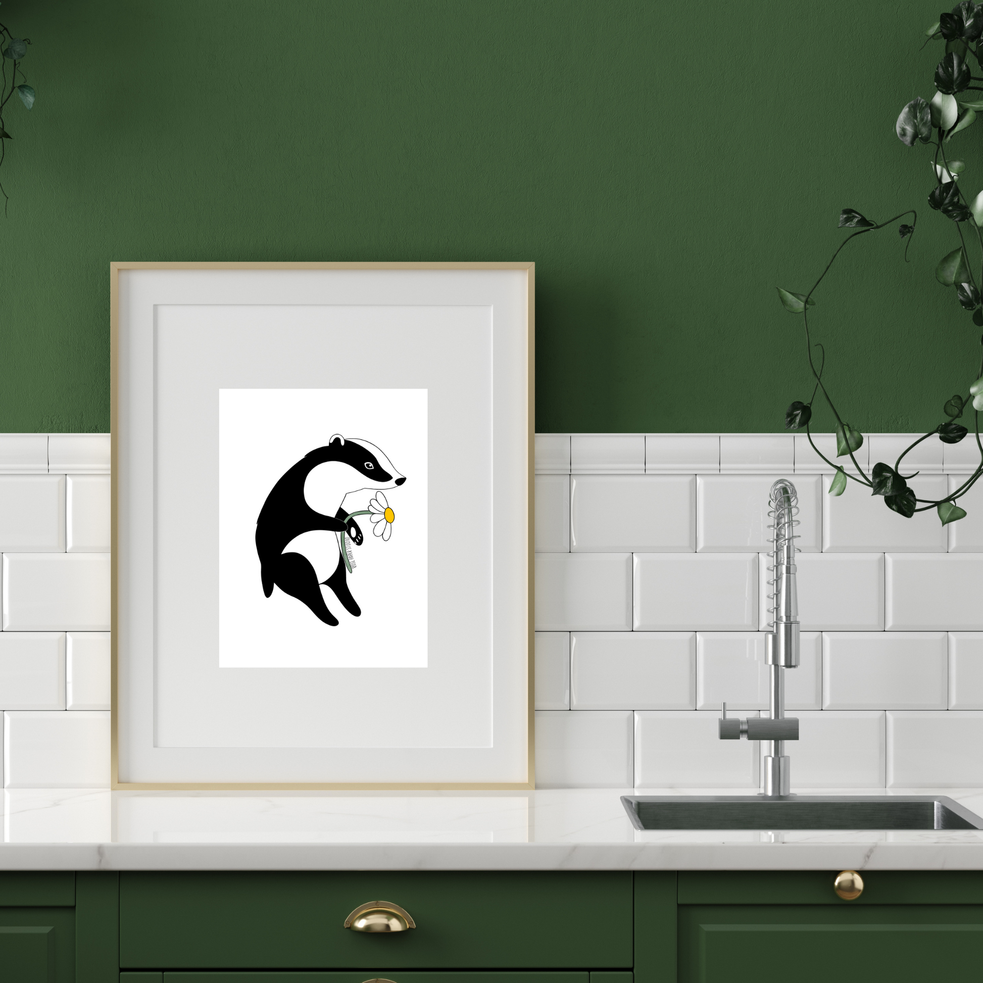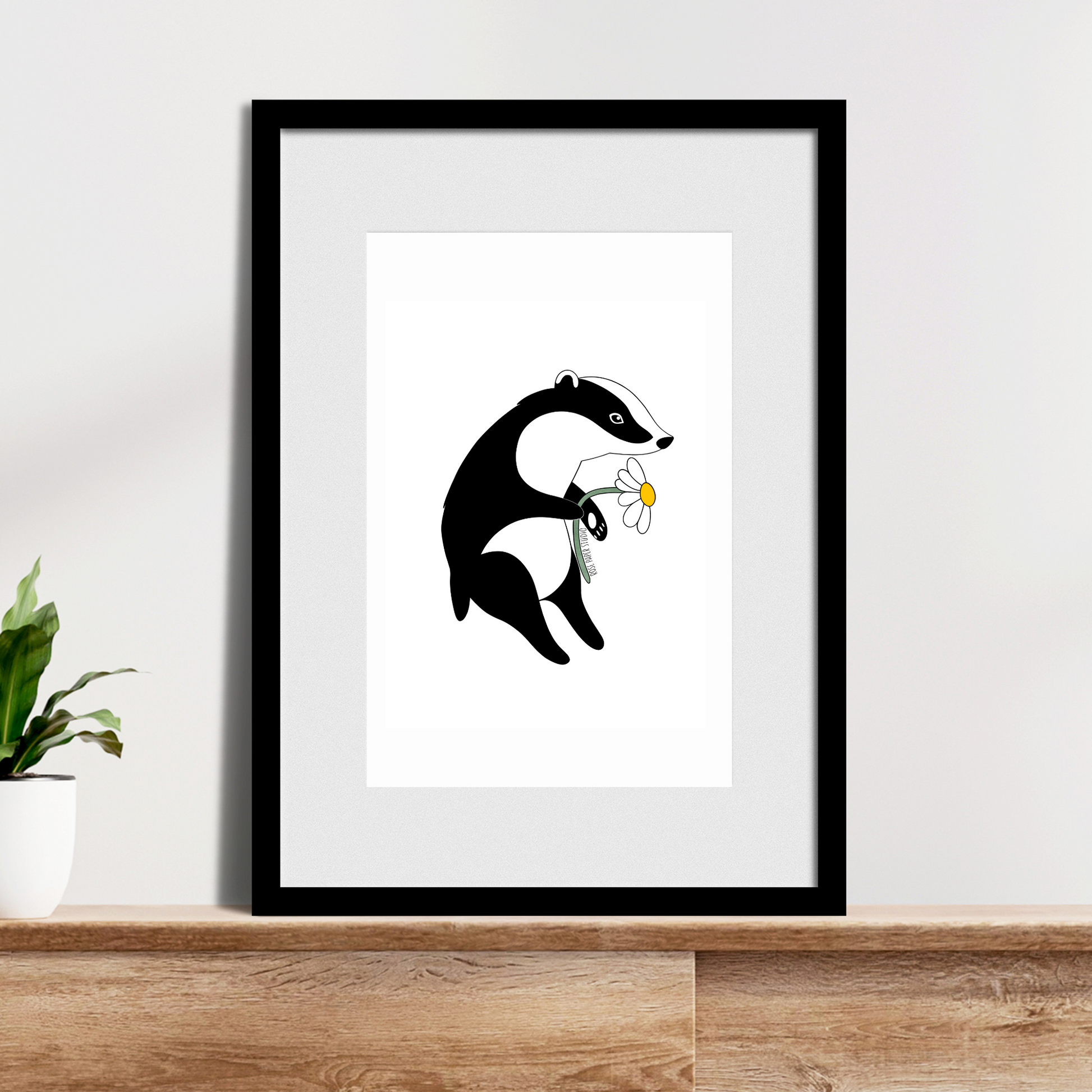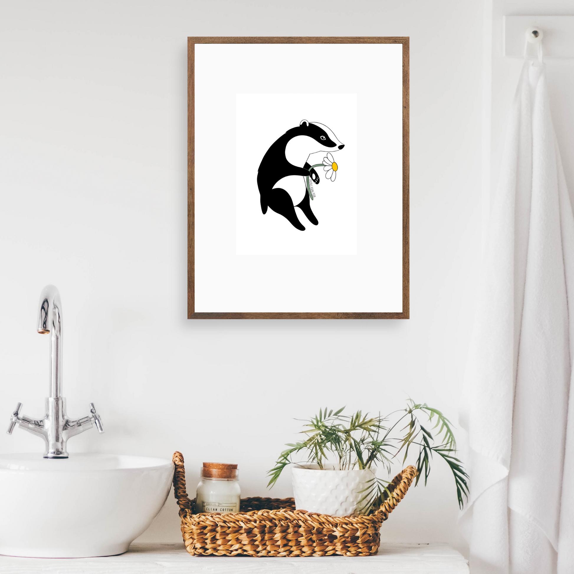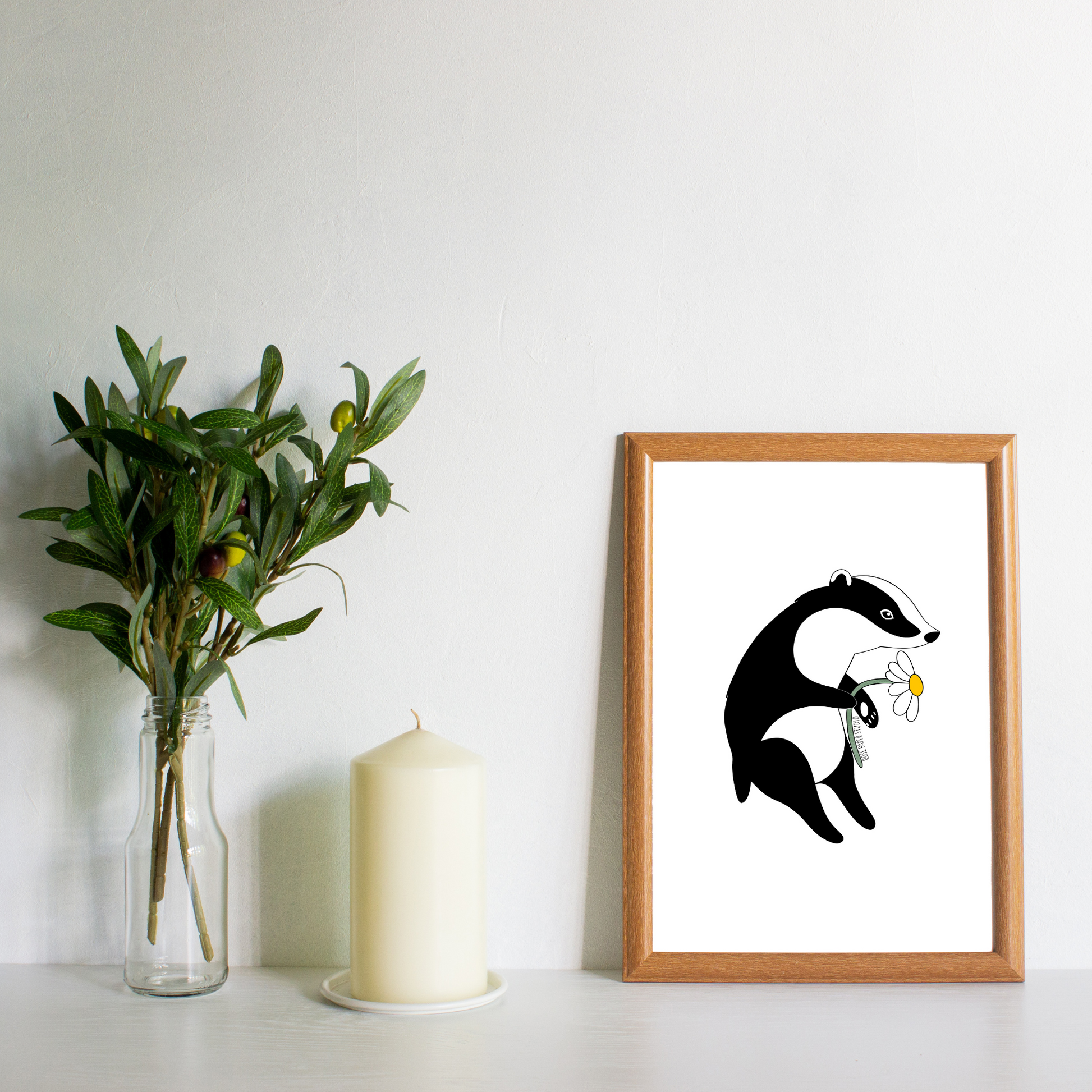 Bernadette the Badger Print | Badger with Daisy Botanical Art | Nursery Wall Art | Home Decor | Hand Drawn Animal Artwork