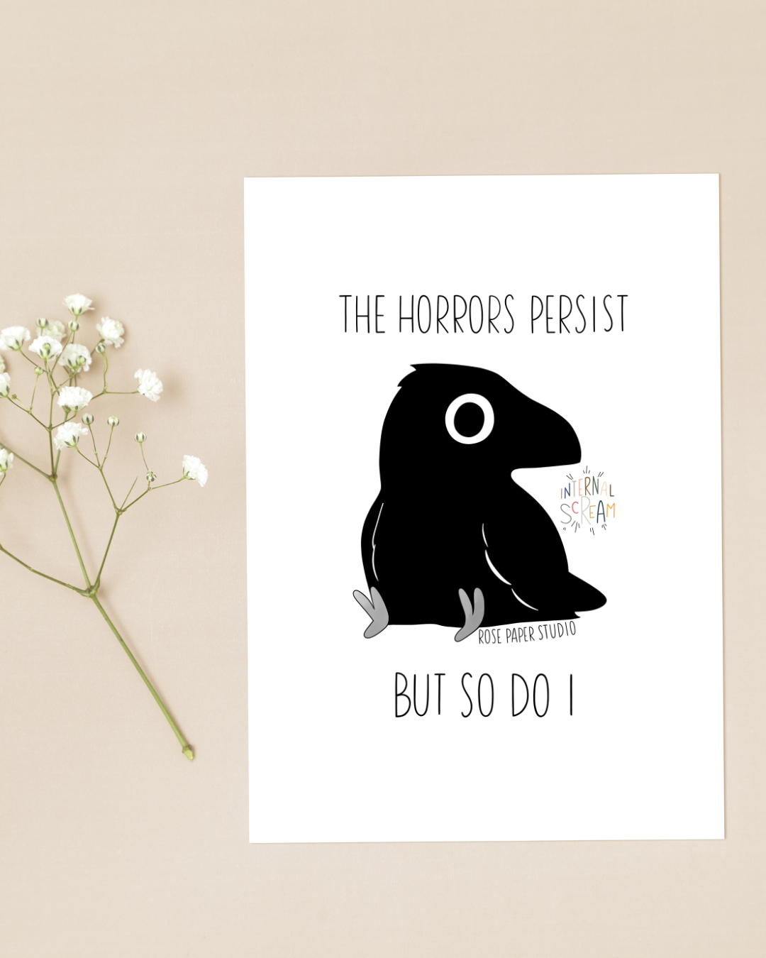 The Horrors Persist But So Do I Card | Edgar the Crow | Blank Modern Calligraphy Greeting Card (Copy)
