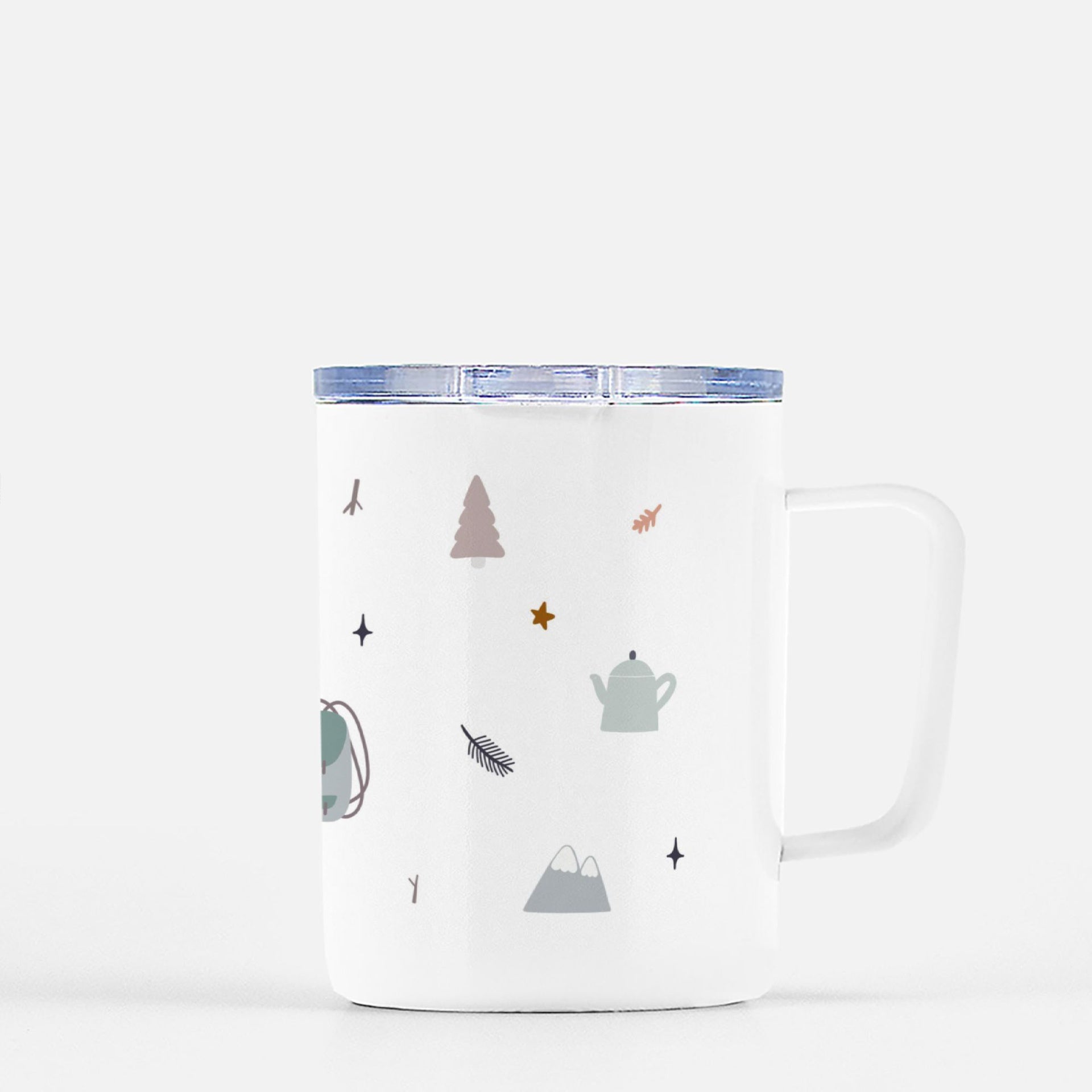 A classic handled mug with a clear travel lid in stainless steel with an adorable print! Easy to hold and convenient to carry from home to office. Keeps beverages warm or chilled.