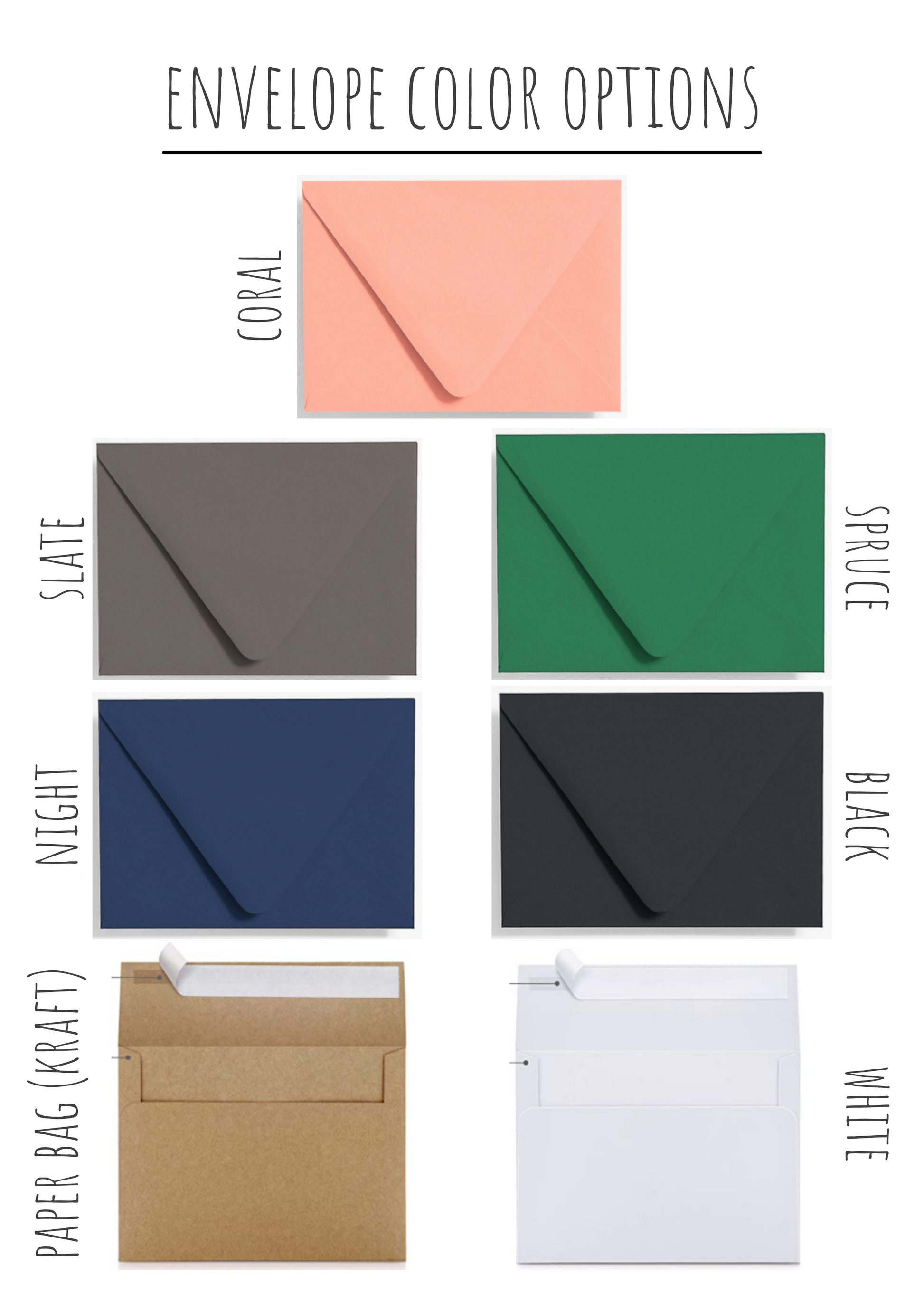 Other colors of envelopes are available upon request. If you would prefer a different color than paper bag (kraft), please put it in the notes in checkout. Options are shown in the last picture.